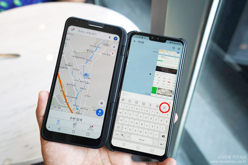 LG V50 ThinQ는 옆 화면을 바로 캡쳐해서 보낼 수 있는 인스턴트캡쳐 기능을 지원합니다. 카카오톡, 문자 하다가 위치를 알려주고 싶을때 이렇게 지도를 띄우고 해당 부분을 캡쳐해서 보낼수가 있습니다. 그리고 보여주고 싶은 웹 화면도 되고 어떤 화면이라도 캡쳐해서 보낼 수가 있습니다.
