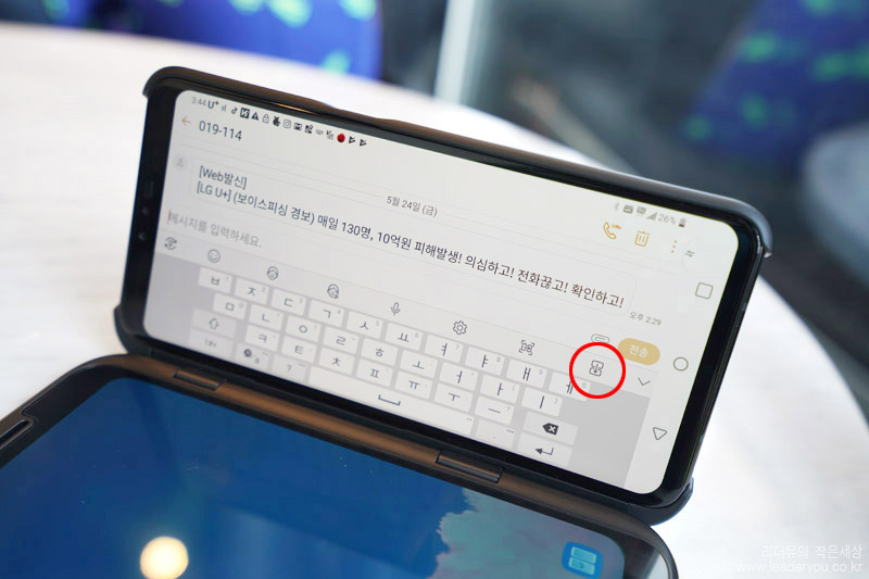 LG V50 ThinQ는 보통의 스마트폰에서는 할 수 없는 키보드 풀화면도 지원합니다. 문자를 받은 화면에서 회신을 하려면 이렇게 키보드가 화면의 절반을 차지 하지만 LG V50 ThinQ는 키보드를 듀얼스크린으로 보낼 수 있습니다.