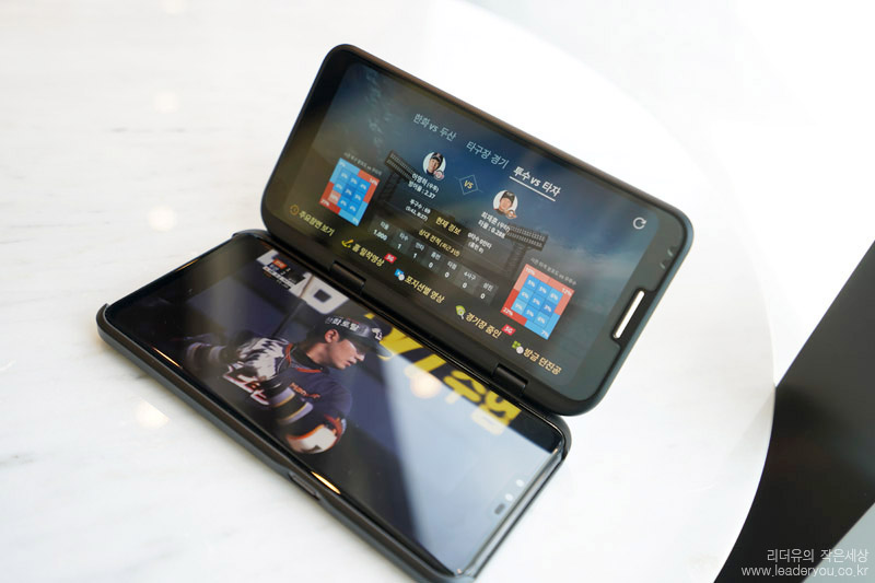 LG V50 ThinQ는 5G 서비스에서도 새로운 매력을 보여주고 있습니다. 유플러스 프로야구의 경우 하나의 화면에서는 야구 중계를 보면서 다른 하나의 화면에서는 각종 정보 확인이 가능합니다.