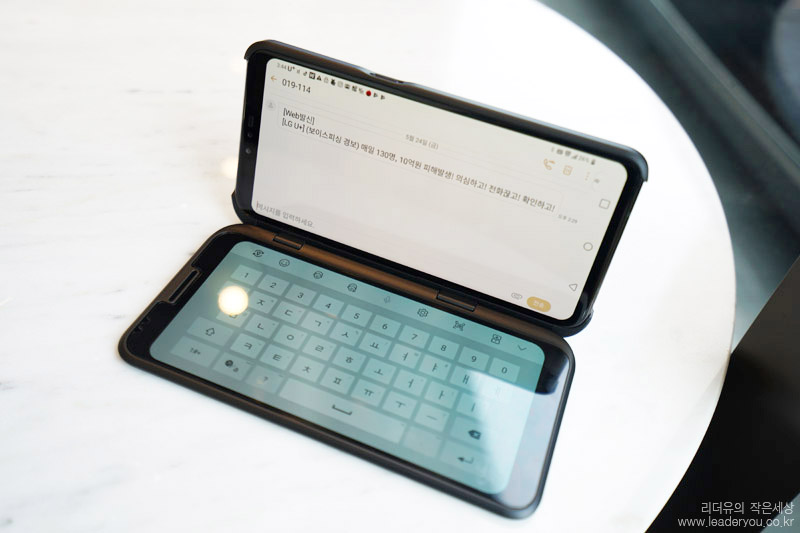 LG V50 ThinQ는 보통의 스마트폰에서는 할 수 없는 키보드 풀화면도 지원합니다. 문자를 받은 화면에서 회신을 하려면 이렇게 키보드가 화면의 절반을 차지 하지만 LG V50 ThinQ는 키보드를 듀얼스크린으로 보낼 수 있습니다.