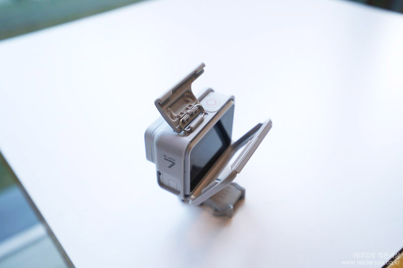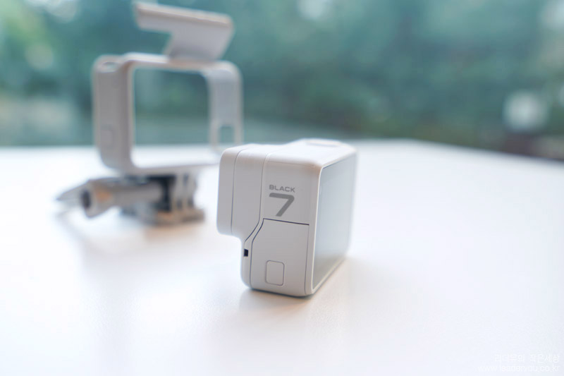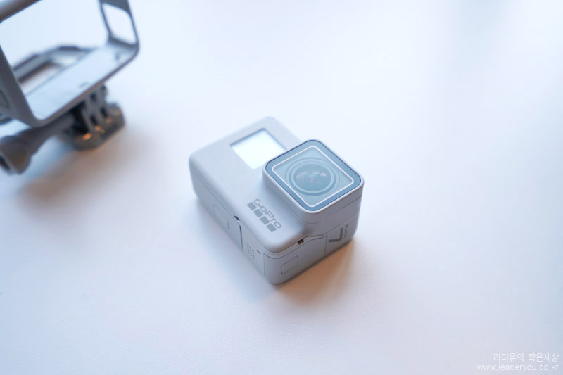 고프로 히어로7 블랙 더스크 화이트 카메라 렌즈 부분은 유리로 보호되어 있습니다. 쉽게 스크레치가 안나지만 혹시나 발생하면 저 부분만 교체가 가능합니다. 그런데 한정판 모델이라 나중에도 화이트 렌즈 덮개가 나올지 궁금하네요.