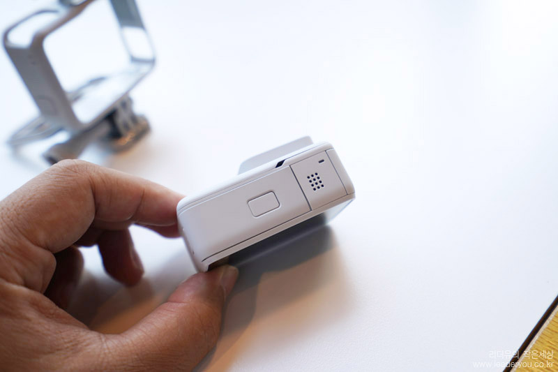 고프로 히어로7 블랙 더스크 화이트 왼쪽면을 보면 전원/홀드 버튼이 있습니다.