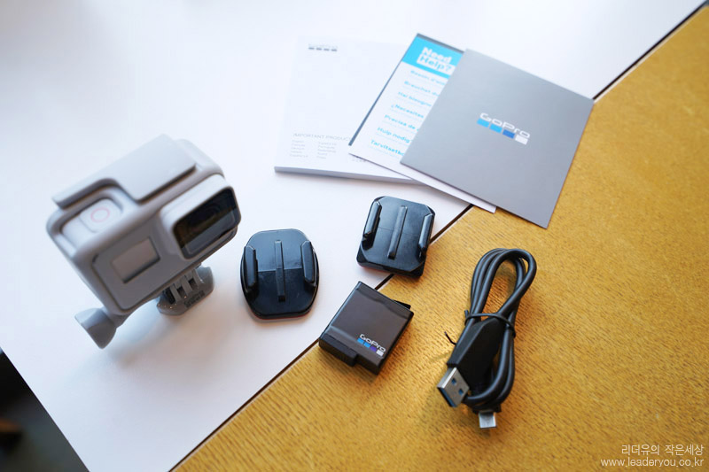 고프로 히어로7 블랙 더스크 화이트 구성품입니다. 구성품도 고프로 히어로7 블랙과 다르지 않습니다. 두가지 마운트, USB-C 케이블, 배터리 1개가 구성품으로 제공됩니다.