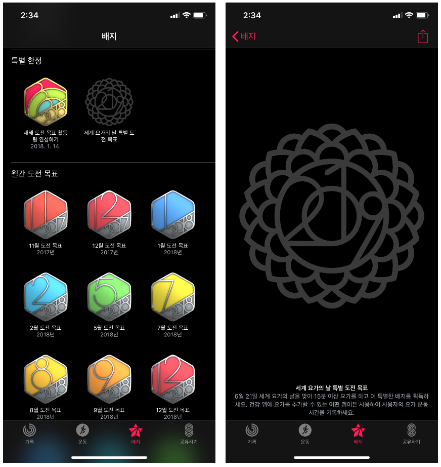 애플 활동앱에 보면 받은 배지가 있습니다. 제가 계속 모으고 있는 배지 현황인데요. 위에 특별한정 보면 세계 요가의 날 특별 도전 목표가 있는걸 확인할 수 있습니다. 달성을 하면 컬러 뱃지를 받게 되고 특별 한정이니 더욱 의미가 있는 배지가 될 것입니다.