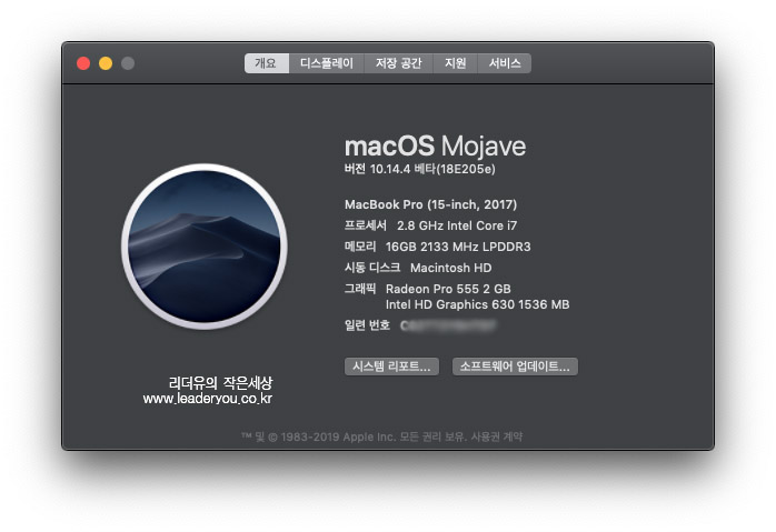 맥북프로 15인치 일련번호 확인은 상단에 사과 로고를 누르고 이 Mac에 관하여를 선택합니다.