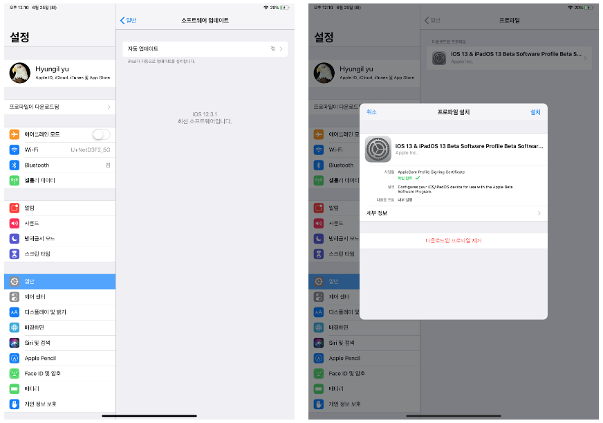 이제 설정으로 가면 이름 밑에 프로파일이 다운로드됨 메뉴가 보일 것입니다. 선택해서 들어가서 설치를 해줍니다.