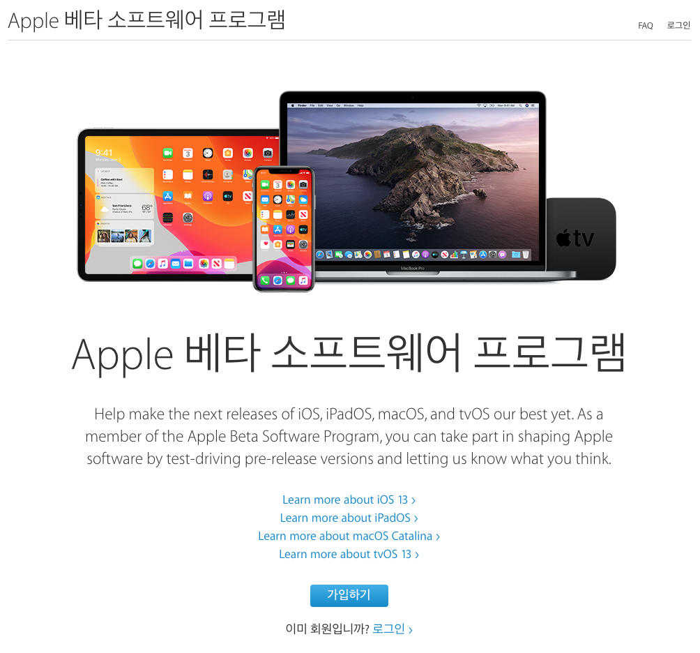 애플 베타 소프트웨어 프로그램 사이트에 가면 새로운 iOS13, iPadOS, macOS Catalina를 접할 수 있도록 안내하고 있습니다.