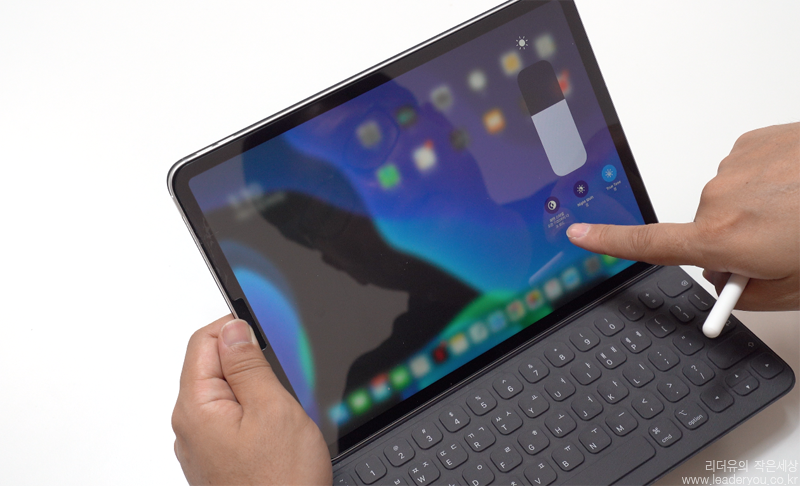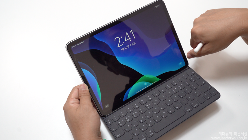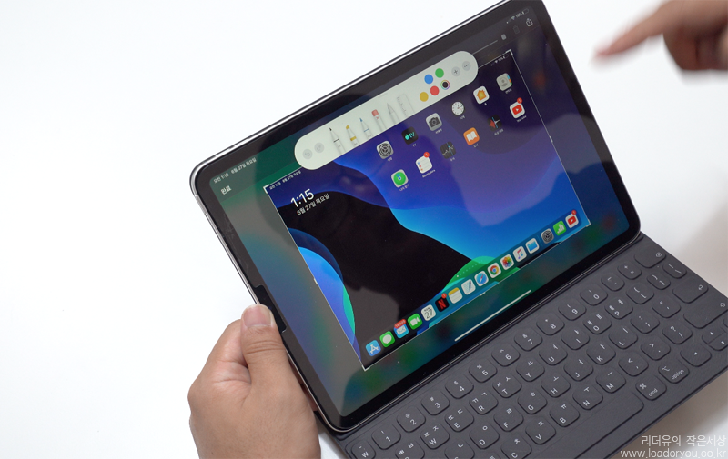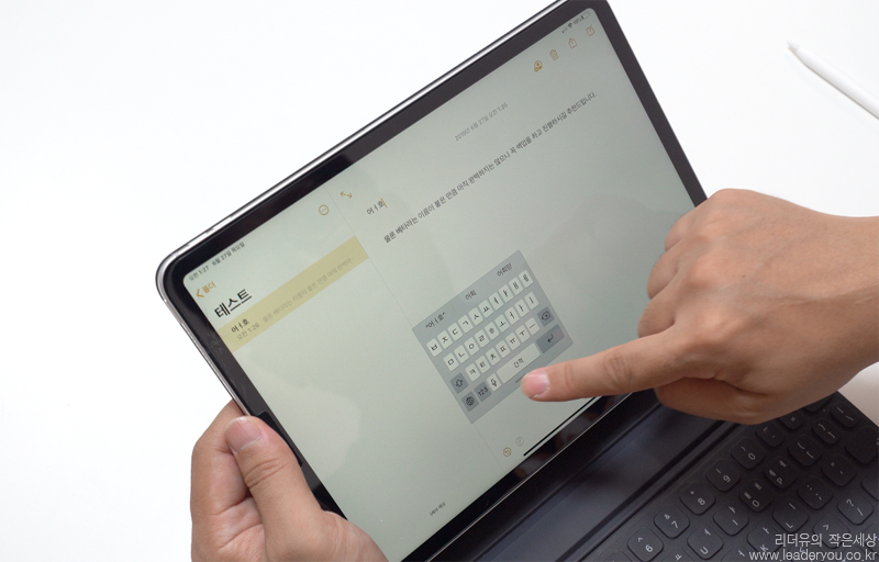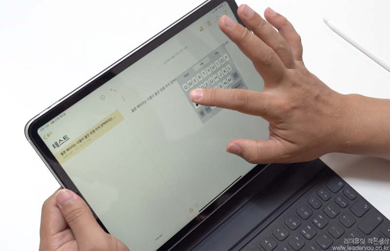 아이패드 키보드도 변화가 생겼습니다. 넓은 화면에서 아무래도 입력이 쉽지 않기 때문에 플로팅 키보드로 사용이 가능합니다. 일반 키보드에서 두손가락으로 오므르기를 하면