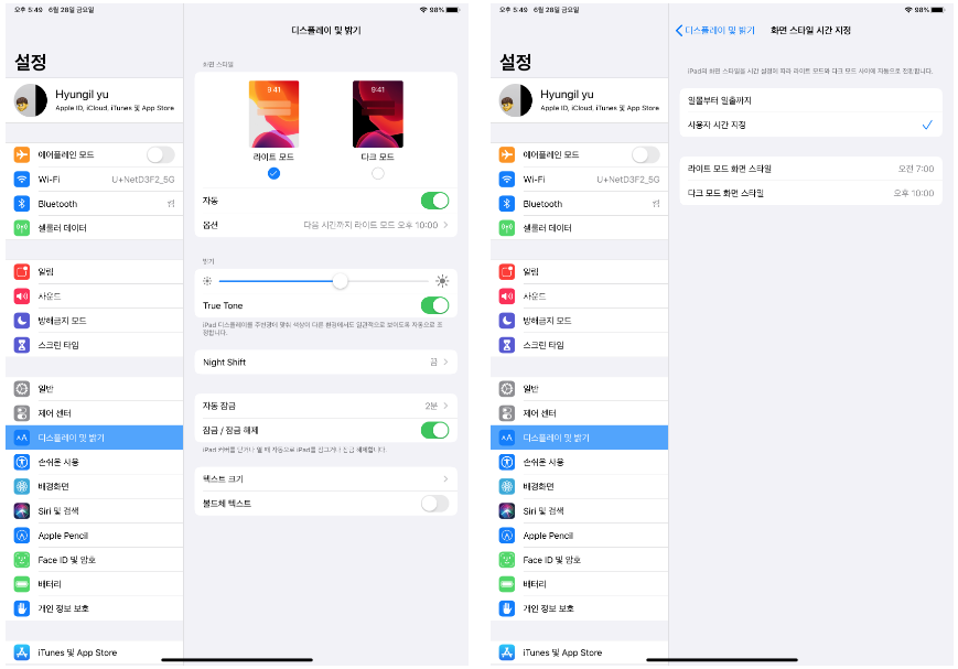 iPadOS (아이패드OS)에서 가장 많이 알려진 변화가 다크모드일 것입니다. 위에 배경화면에서도 달라진 점을 알려드렸는데요. 디스플레이 및 밝기에서 다크 모드 설정이 가능하고 시간대 지정을 하면 자동으로 라이트 모드와 다크모드가 변경이 됩니다. 그래서 매일 두개의 태블릿PC를 만나는 듯한 기분을 느낄 수 있습니다.