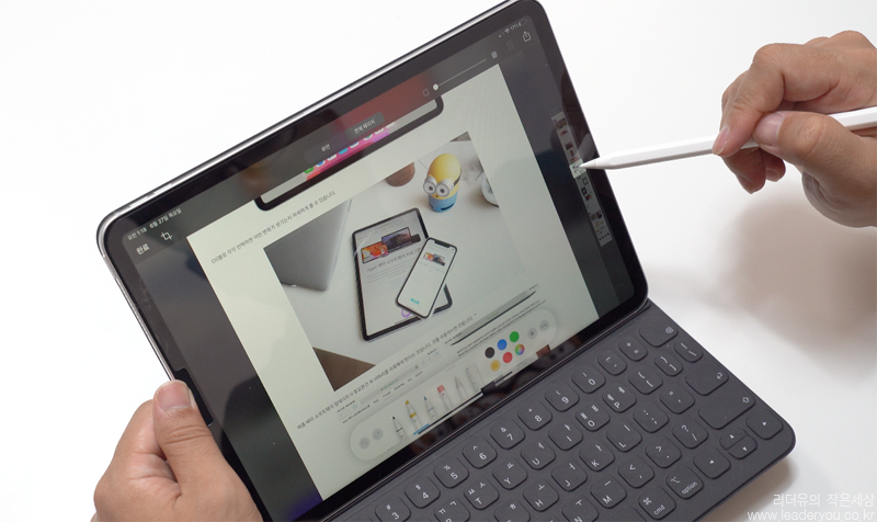 아이패드에서 캡쳐하는 것도 이제 애플펜슬만으로도 가능해졌습니다. 왼쪽 하단 모서리에서 대각선으로 끌어오면 바로 캡쳐가 됩니다.