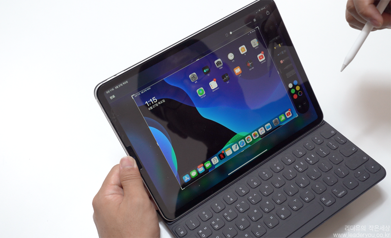 아이패드에서 캡쳐하는 것도 이제 애플펜슬만으로도 가능해졌습니다. 왼쪽 하단 모서리에서 대각선으로 끌어오면 바로 캡쳐가 됩니다.