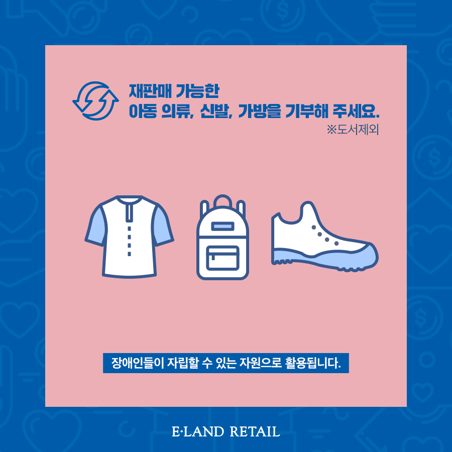 집에 보면 분명 안입는 아동 의류, 신발, 가방이 있을 것입니다. 멀쩡해서 가지고만 있을텐데요. 이랜드리테일 기부캠페인에 기부하면 뜻깊은 곳에 사용이 될 수 있습니다. 버려지는 옷들이 제대로 사용될 수 있는 기회이고 환경 보호에도 기여할 수 있기 때문에 집에 있는 물건들을 정리해 보시면 좋을 것 같습니다.
