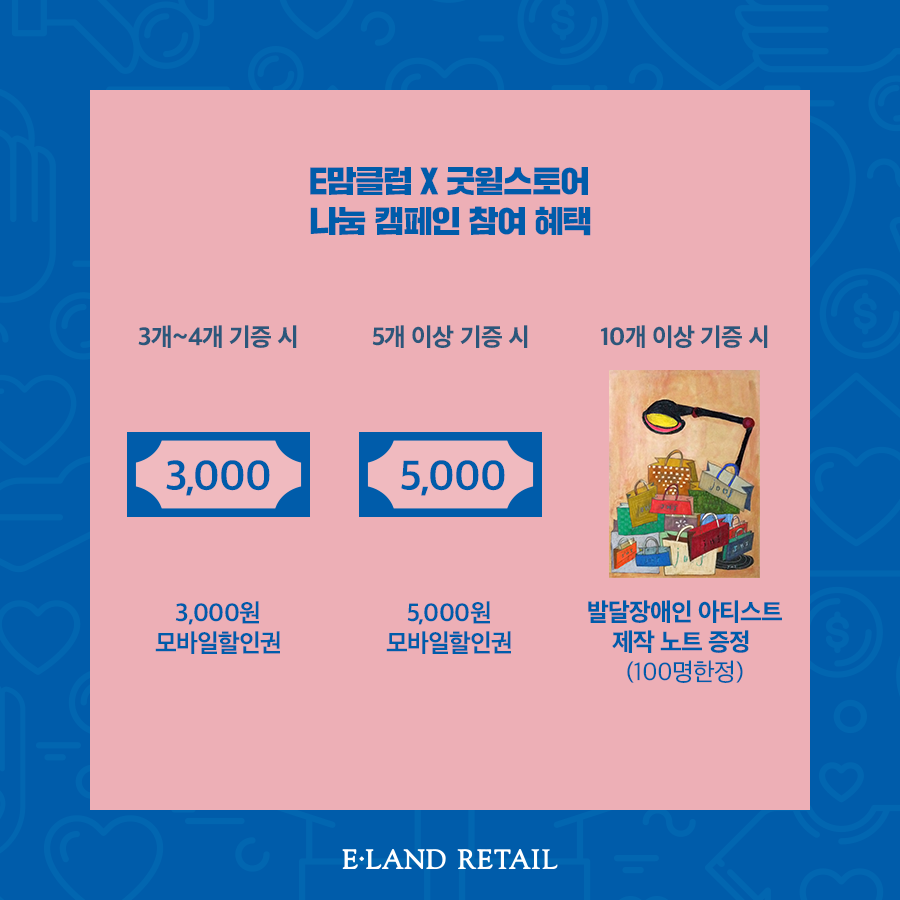 함께 나누는 기쁨을 실천하고 있는 이랜드리테일 기부캠페인 E만클럽 굿윌스토어 나눔캠페인이니 여러분도 좋은일에 동참해 보시기 바랍니다. 그리고 보너스 이벤트로 기부 인증샷을 #E맘클럽 #이맘을나눠요 해시태그와 함께 인스타에 올리시면 2분을 추첨해 이랜드 모바일 상품권 5만원을 제공하니 도전해 보시면 좋을 것 같습니다.