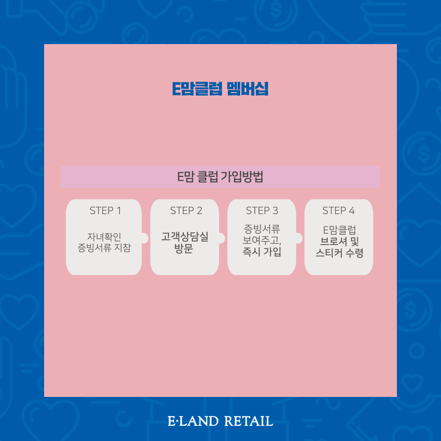 이랜드리테일 E맘클럽 가입은 자녀확인 증빙서류를 지참하고 NC강서점, NC송파점, NC수원터미널점, 2001중계점, NC서면점 고객상담실 방문해서 가입하면 됩니다.