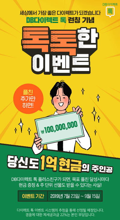 무려 1억 현금을 내 건 DB다이렉트 톡 톡톡한 이벤트는 DB다이렉트 톡 오픈을 기념하는 이벤트인데요. 이벤트기간은 7월 23일부터 9월 15일까지 진행됩니다. 플친 달성시마다 현금과 선물이 기다리고 있습니다.