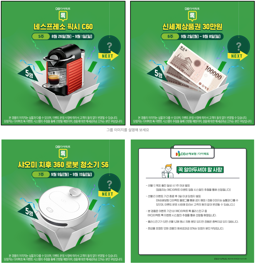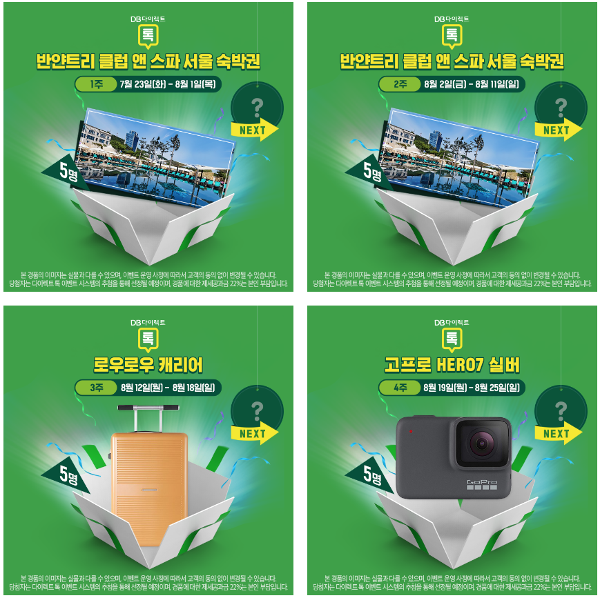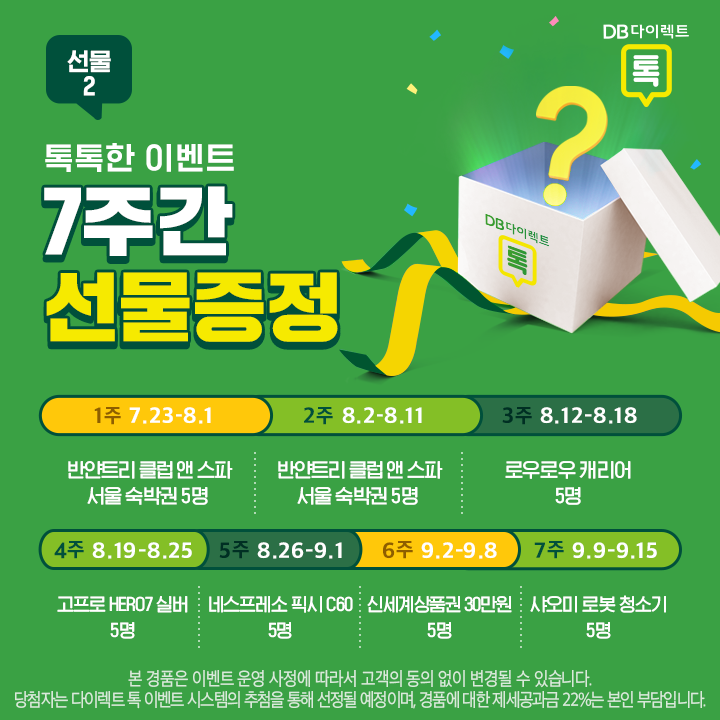 매주 설레이는 마음으로 기다려 볼 수 있는 이벤트라 7주간 즐거울 것 같습니다. 복잡하게 참여하는 이벤트가 아닌 만큼 가볍게 DB다이렉트톡 카톡플친 되시고 행운도 잡아 가시기 바랍니다. 주인공은 누가 될지 아무도 모릅니다.