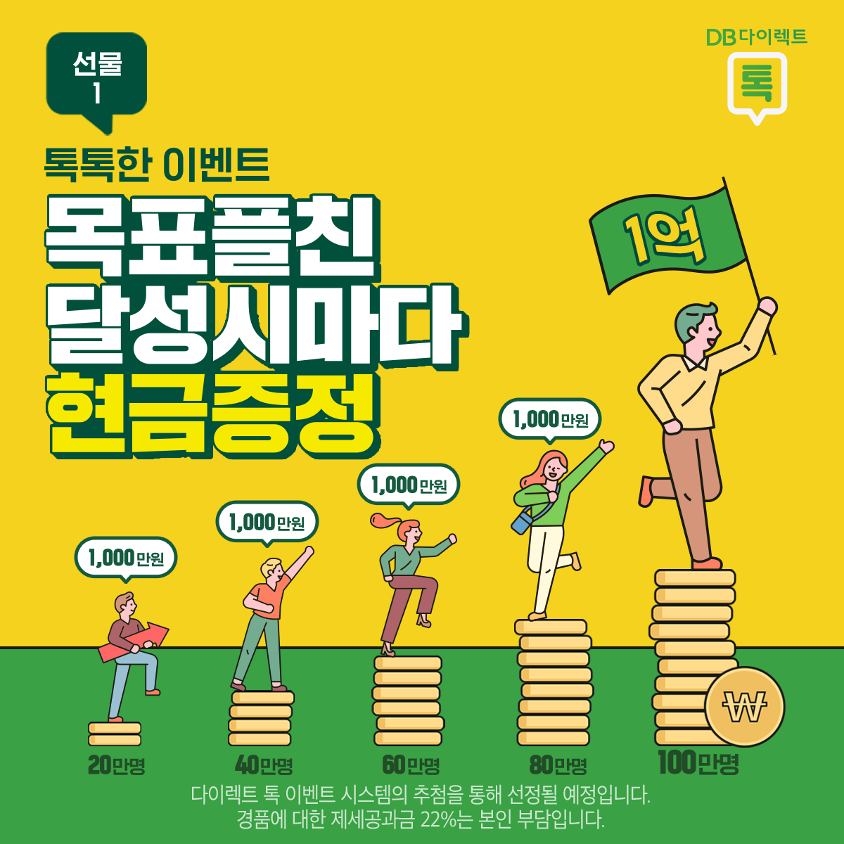 선물1은 DB다이렉트톡 카톡풀친 20만명, 40만명, 60만명, 80만명, 100만명이 될때마다 현금이 증정됩니다. 20만명, 40만명, 60만명, 80만명 구간에는 1,000만원씩 현금이 주어지고 100만명이 달성되면 1억이 주어집니다. 현금만큼 좋은 것도 없기 때문에 100만명은 무난히 달성하지 않을까 합니다. 랜덤 추첨이니 누가 될지 모릅니다. 여러분이 그 주인공일 수 있습니다.