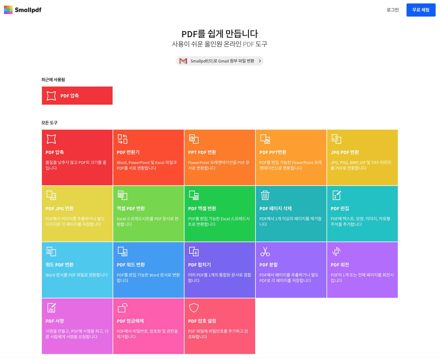 Smallpdf 사이트 입니다. 직관적으로 어떤 서비스를 이용해야 할지 나와 있습니다. 맨 왼쪽에 PDF 압축 메뉴를 이용하면 되고 품질을 낮추지 않고 압축을 해주기 때문에 좋습니다.
