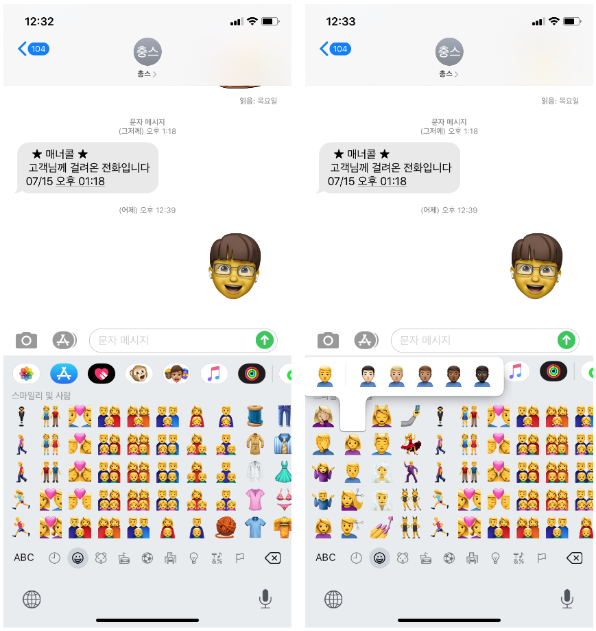 커플, 친구를 표현하는 이모티콘은 성별 외에도 다양한 피부색을 조합하여 선택할 수 있습니다. 지금은 하나의 피부색으로만 인종을 보여줬지만 글로벌 시대에 걸맞게 다양한 인종과 표현의 범위가 넓어졌습니다.