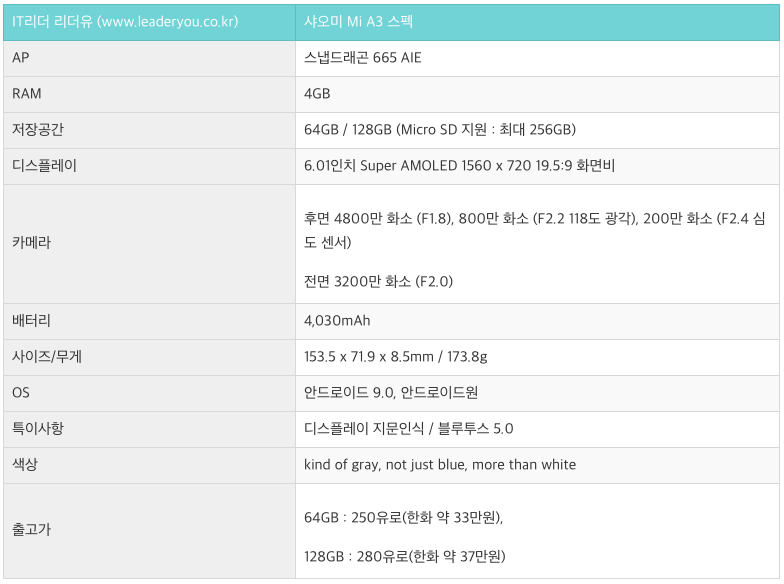 최근 안드로이드폰은 플래그십 스마트폰 경쟁 보다는 보급형 스마트폰에서 치열한 경쟁을 벌이고 있습니다. 삼성은 갤럭시 M시리즈를 비롯해 갤럭시A 시리즈로 중국 스마트폰과의 전면전을 벌이고 있는데요. 샤오미도 이에 질세라 계속해서 가성비 스마트폰을 선보이며 삼성을 긴장하게 만들고 있습니다. 오늘은 샤오미의 3번째 안드로이드원 스마트폰 샤오미 미 A3 (Mi A3)는 어떤지 알려드릴테니 참고해 보시기 바랍니다.