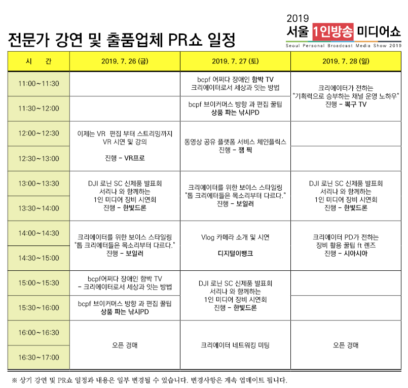 2019 인쇼 일정은 7월 26일(금)~28일(일) 까지이고 오전 10시부터 오후 5시까지 진행됩니다. 가장 인상적인 부분은 주최가 실제로 유튜버들이 모여있는 (사)한국디지털콘텐츠크리에이터협회에서 한다는 것입니다. 유튜버 고민을 풀수 있는 의미있는 행사이고 알찬 프로그램이 준비되어 있어 꼭 가볼만한 행사입니다.