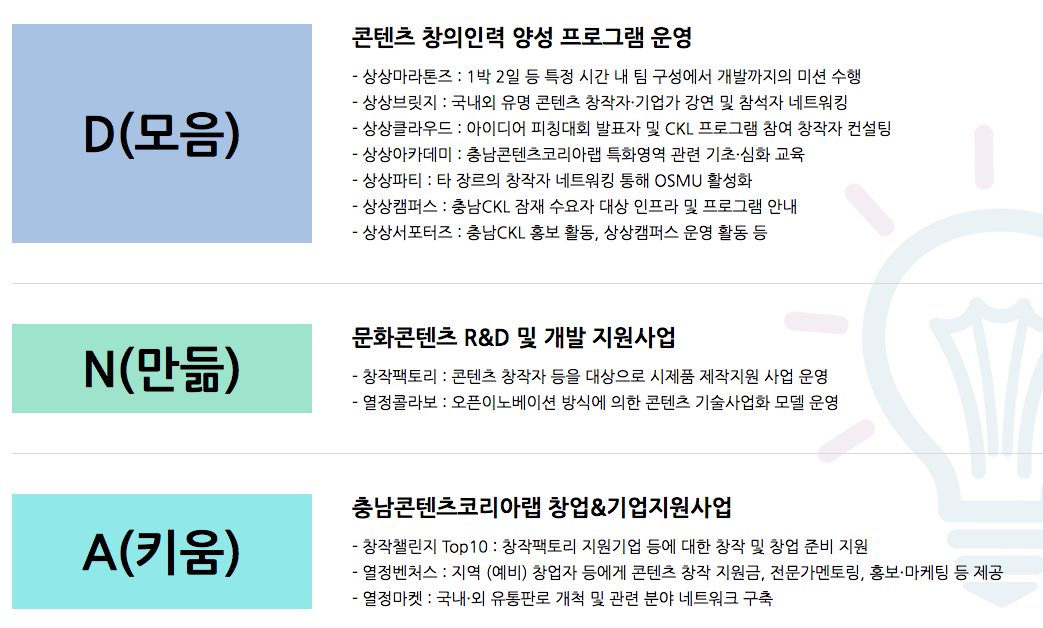 충남콘텐츠코리아랩은 상상마라톤즈, 상상브릿지, 상상클라우드, 상상아카데미, 상상파티, 상상캠퍼스, 상상서포터즈로 다양한 콘텐츠 창의인력 양성 프로그램을 운영하고 문화콘텐츠 R&D 개발 지원사업, 충남콘텐츠코라이랩 창업 및 기업지원사업을 하고 있습니다. 충남에 거주하는 분이라면 꼭 확인해 봐야 할 부스이니 참고해 보시기 바랍니다.