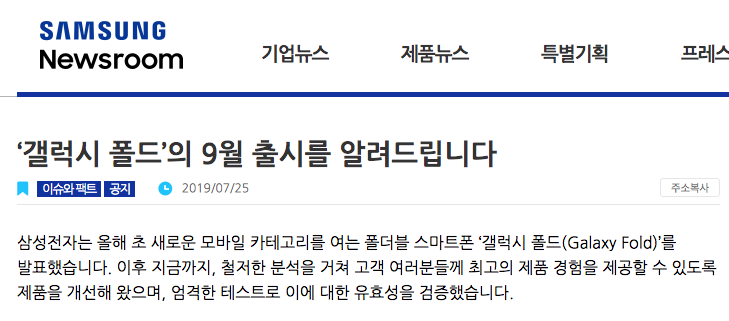 이전까지는 대략 출시 시점을 이야기 하는 것으로 그쳤지만 이번엔 삼성 뉴스룸에 공지로 등록하면서 갤럭시폴드 출시일을 명확히 했습니다. 7월 출시가 예상되었지만 불발되면서 이제 더 이상 미룰 수 없다는걸 삼성도 인지하고 있기에 9월까지는 무조건 출시하겠다는 의지를 표명한 것입니다.