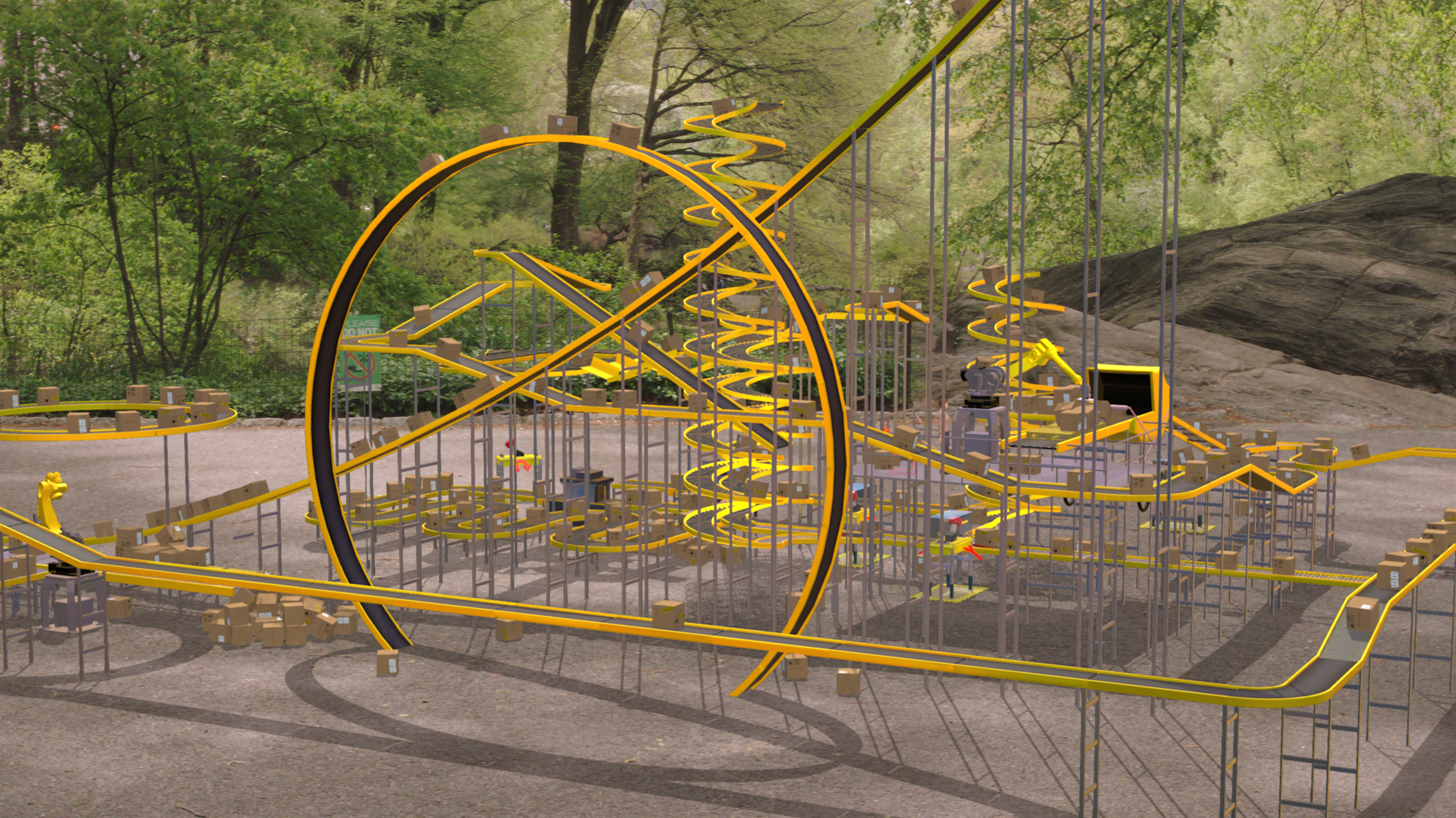 차오페이의 작품 "Trade Eden"은 일부는 유령의 집이고 일부는 자동화된 공장으로 참여자들이 새로운 쓸모 없는 기계를 상상하며 포장한 물건을 얼마나 잘 다루는지 테스트하게 한다고 합니다.
