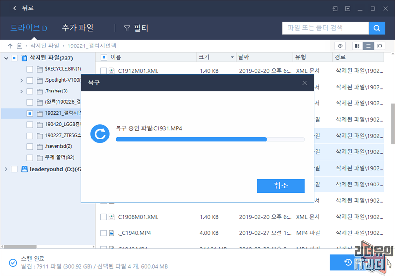 파일 복구가 필요한 저장공간을 선택하고 스캔을 합니다. 위 화면은 외장 HDD를 스캔하고 있습니다. 왼쪽에 보면 삭제된 파일이라고 구분된 파일 폴더가 있습니다. 삭제 파일들이 뭐가 있는지 다 체크가 되는걸 알 수 있습니다.