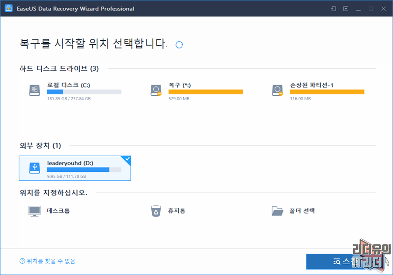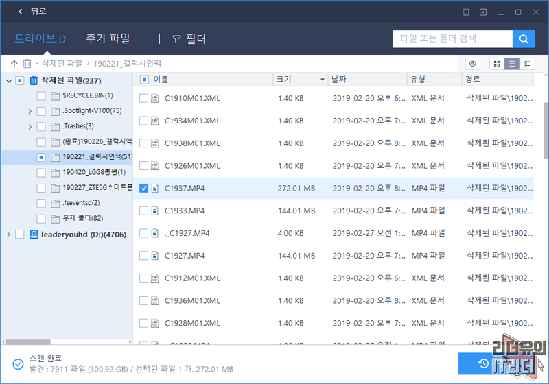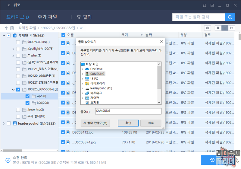 복구할 폴더나 파일을 선택후 복구를 누르면 복구할 폴더를 선택하게 나옵니다. 이때 다른 저장공간에 저장하면 됩니다.