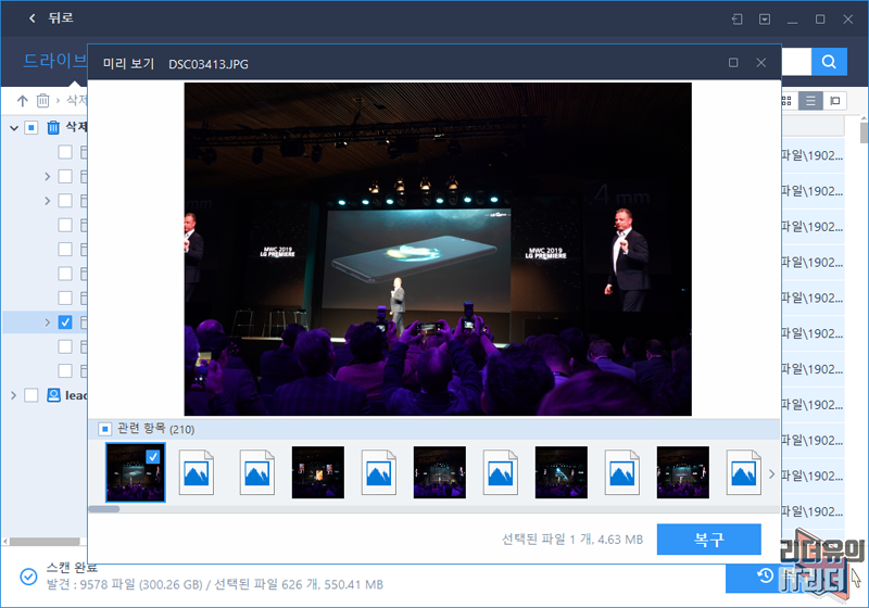 스캔 완료 후 삭제된 파일 폴더에 가서 누르니 이렇게 미리 보기가 됩니다. 해당 사진이 맞는지 보고 복구를 할 수 있게 지원하는 것입니다.