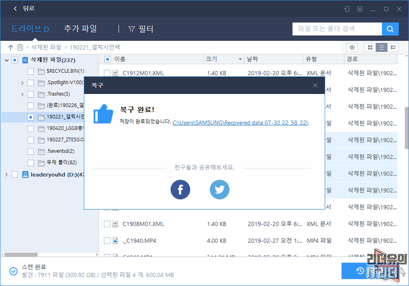 복구가 완료되면 어떤 경로에 복구가 되었는지 친절하게 안내를 해줍니다. 해당 링크를 누르면 복구된 파일로 바로 들어갈 수 있습니다.