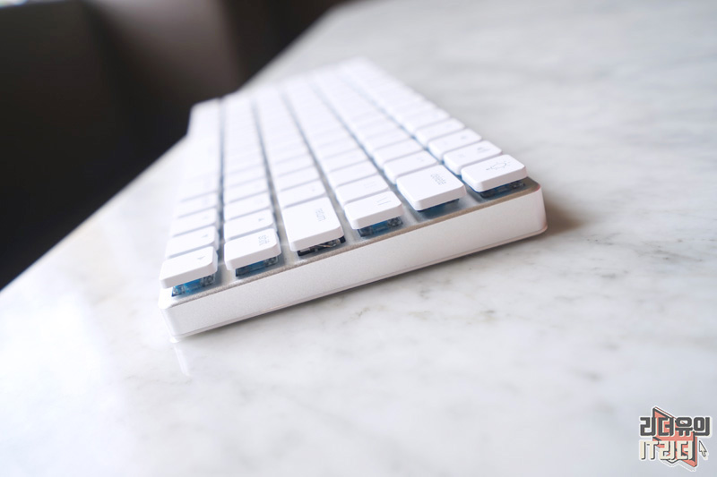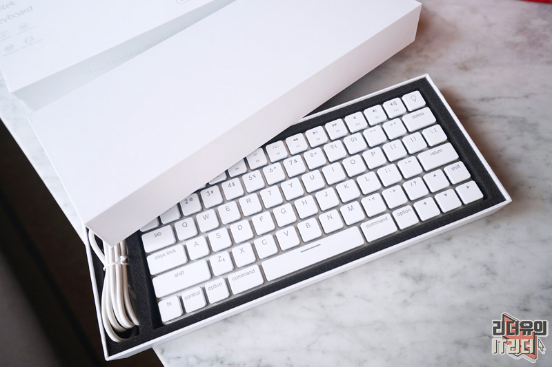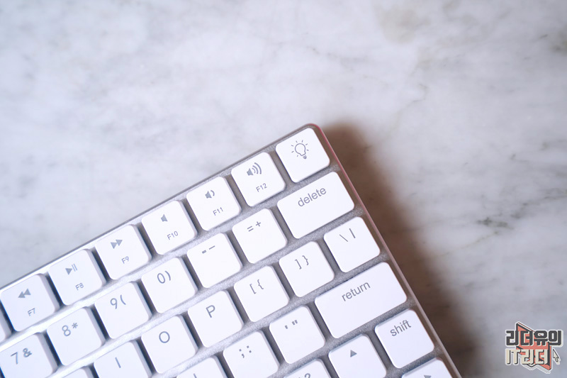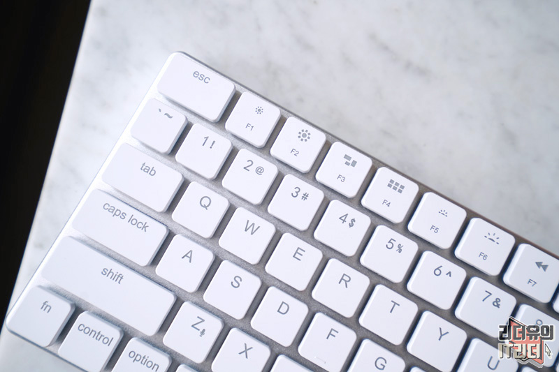 상단에 기능키도 애플 키보드에 적용되는 배열 그대로 입니다. 참고로 78키 키보드이고 옵션으로 윈도우 키 배열로 교체도 가능합니다. 기계식 키보드는 키캡을 쉽게 제거할 수 있기 때문입니다. 그리고 한국에 출시되는 제품은 한글 키캡이 적용되니 참고해 두세요~