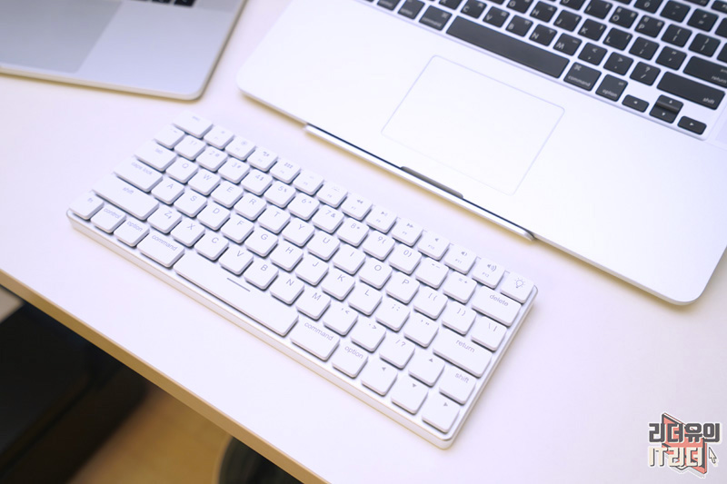 애플 매직키보드2와 비교한 모습입니다. 사이즈도 거의 비슷하고 키배열 구조도 같아서 맥 사용자들은 편하게 사용할 수 있습니다.