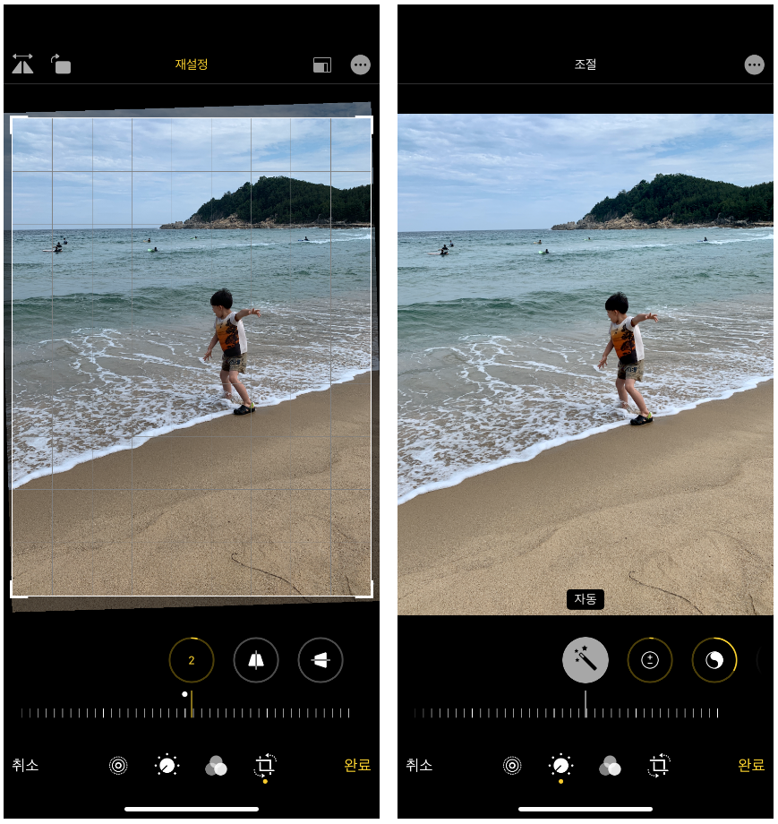 사진의 완성은 보정입니다. 사진 작가들의 전문적인 사진들도 원본이 아닌 보정을 통해 완성된 사진입니다. 아이폰은 사진 보정을 쉽게 할 수 있도록 편집 기능이 잘 되어 있습니다. 사진의 각도를 조절하고 밝기 등을 조절하면 더욱 예쁜 결과물을 완성할 수 있습니다.