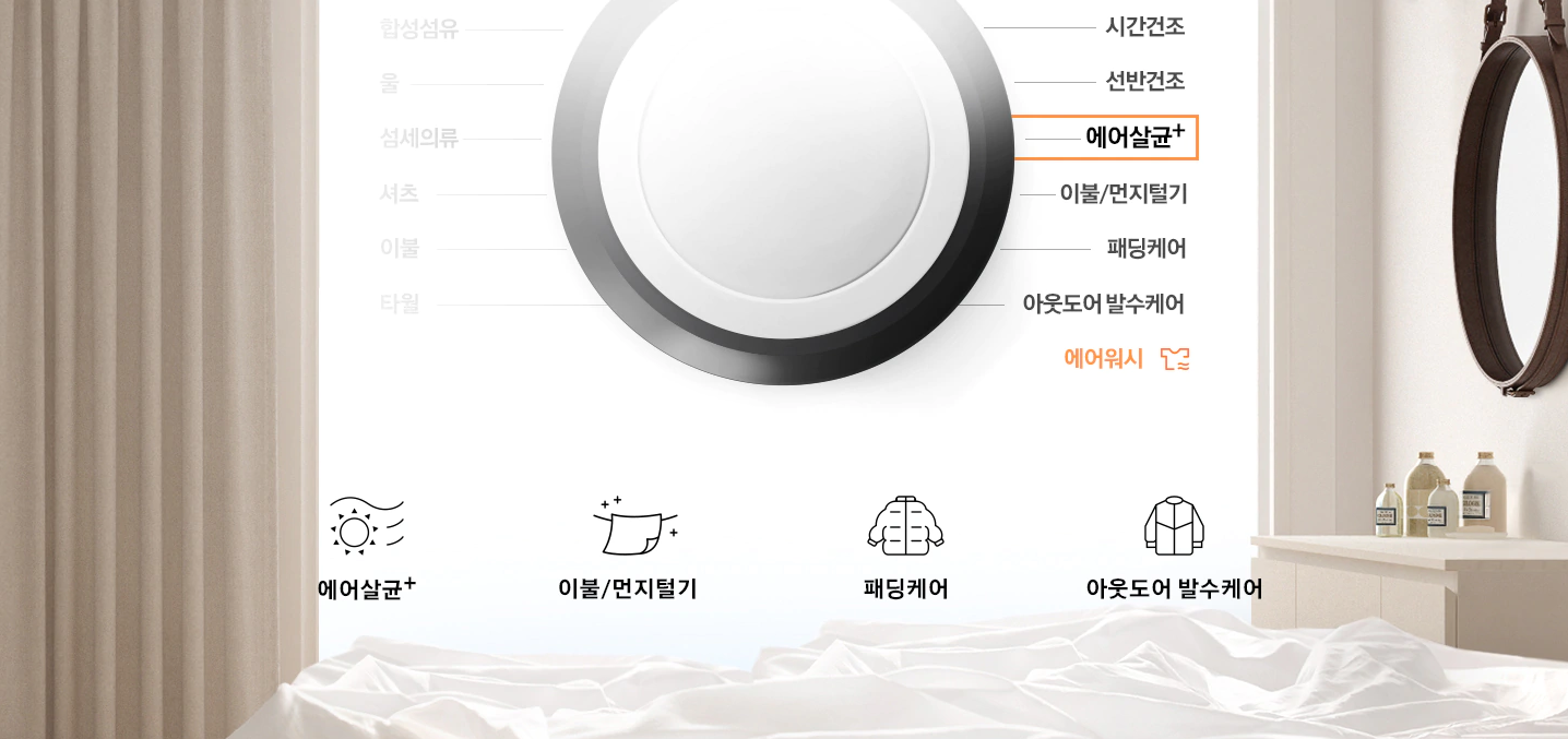 그리고 에어살균+ 기능으로 유해 세균, 진드기 꽃가루 등을 제거할 수 있습니다. 외출하고 와서 건조기를 돌리는 것만으로도 상쾌한 기분을 느낄 수 있을것 같습니다.