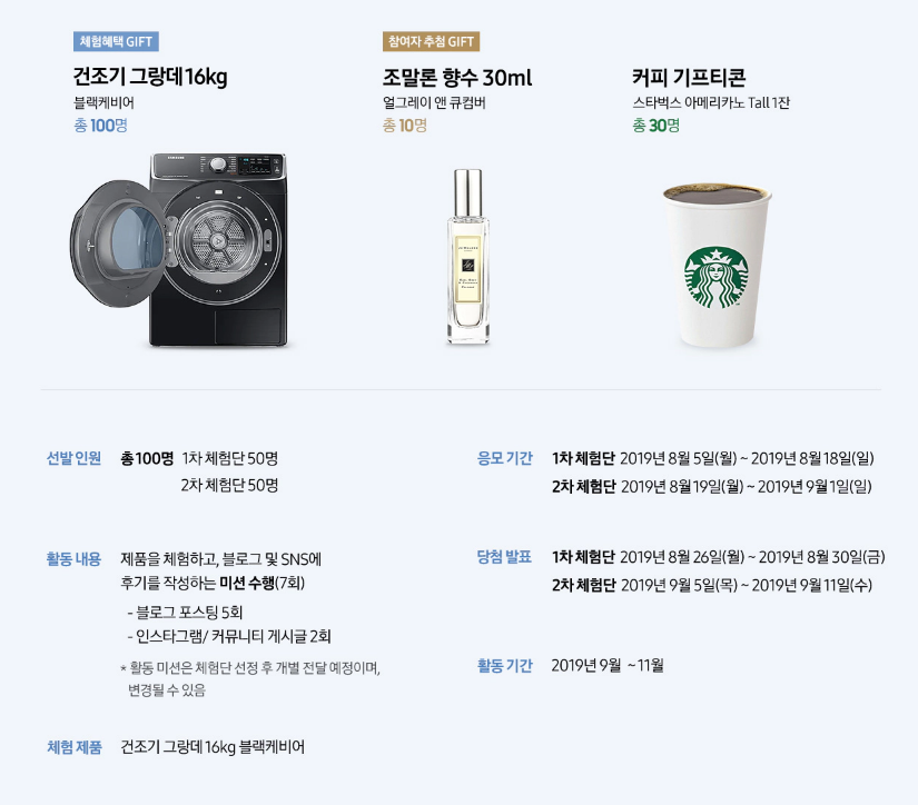 삼성 건조기 그랑데 안심건조 체험단은 1차, 2차로 나눠 진행되고 건조기 그랑데 16kg 블랙케비어를 경험하게 됩니다. 건조기 궁금하신 분들은 꼭 도전해 보시기 바랍니다.