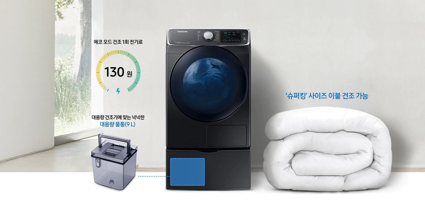 국내 최대 건조 용량을 가진 삼성 건조기 그랑데 16kg는 슈퍼킹 사이즈의 이불도 건조가 가능해 빨래를 가리지 않습니다. 대형 이불 같은 경우는 건조 걱정때문에 세탁을 잘 안하게 되는데 걱정 없이 할 수 있는 대형 건조기입니다.