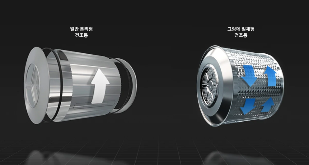 일체형 건조통도 경쟁력입니다. 분리형 건조통의 경우는 바람, 먼지 습기가 새어 나가 건조 효율이 떨어질 수 있는데요. 일체형 건조통은 효율적인 건조가 가능합니다. 그리고 양방향 회전을 지원해 빨래 꼬임도 해결하고 있습니다.