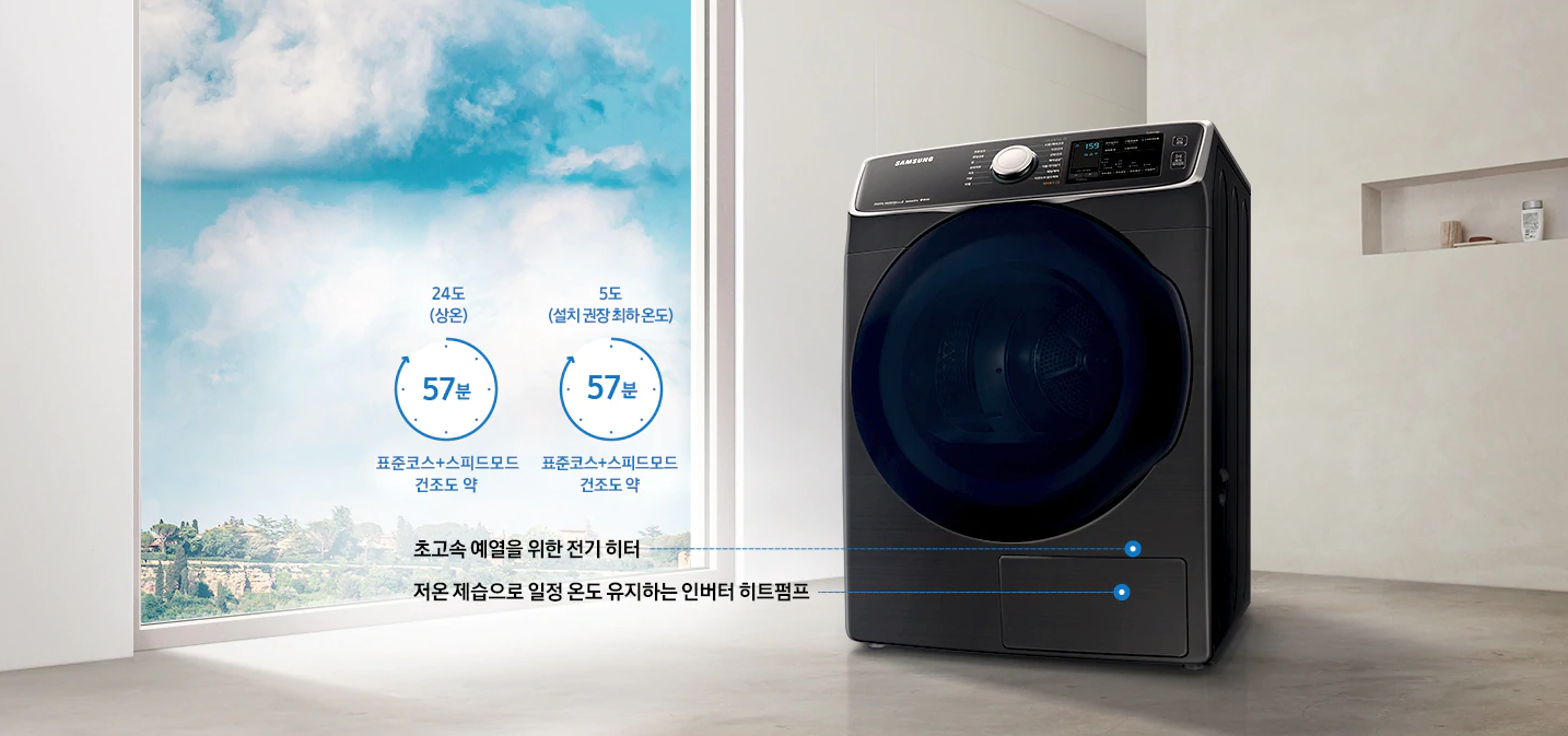 삼성 건조기 그랑데 16kg는 건조기에서 무엇보다 중요한 빠른 속도도 가지고 있습니다. 예열 기능을 가지고 있어 빠르게 공기를 데울 수 있어 사계절 내내 빠른 건조가 가능합니다.