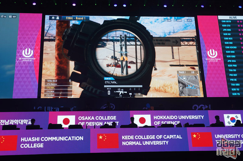 저녁시간에는 아시아 주요 5개국 (한국, 중국, 일본, 필리핀, 태국)이 참여한 글로벌 대학생 배틀그라운드 대회 결승전이 펼쳐졌습니다. 각 국가에서 선발전을 뚫고 올라온 17개팀으로 구성되었는데요. 한국은 8팀, 중국 3팀, 태국은 2팀, 필리핀 2팀, 일본 2팀이었습니다. 총 4라운드에 걸친 대규모 전투가 펼쳐졌고 살아남은 순서별로 점수를 받고 킬포인트 점수를 얻어 종합 점수로 순위가 결정되었습니다. 우승상금은 1등 2천만원, 2등 1천만원이 걸려 있어 흥미진진한 대결을 볼 수 있었습니다.