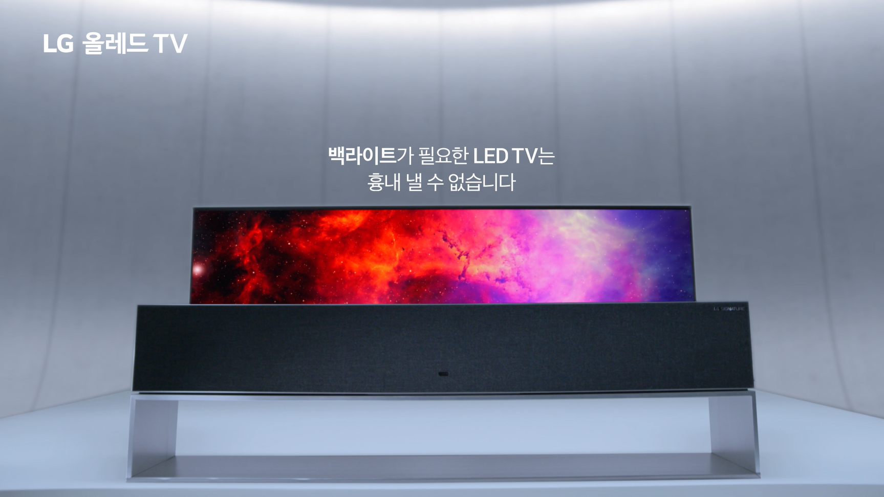 백라이트가 없다는 점은 TV 디자인의 한계를 돌파할 수 있다는 의미도 됩니다. 단순히 얇은 두께로만 구현이 가능한 것에서 그치지 않고, Flexible(휘는 모양의) 디스플레이도 구현이 가능합니다. 올해 초 CES 2019에서 첫 선을 보였던 LG 시그니처 올레드 R (롤러블 TV)가 대표적인 예시라고 할 수 있습니다. LED TV로는 이러한 디자인을 꿈꾸기 어렵죠.