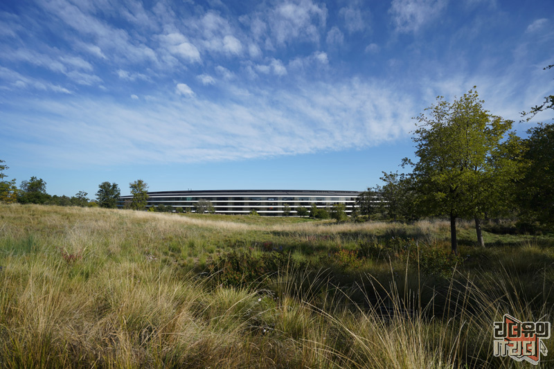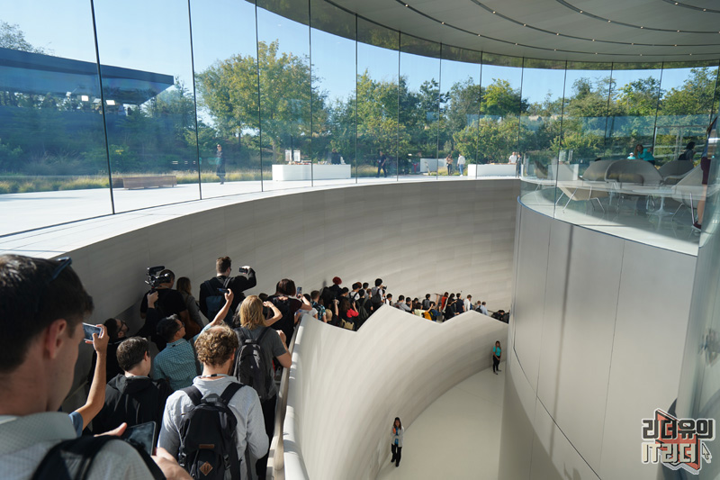 아이폰11 발표가 있었던 스티브잡스 시어터는 원형의 큰 애플 스토어처럼 생겼습니다. 사방이 다 투명한 통유리로 되어 외부와 내부가 자연스럽게 이어지는 연속성있는 건물을 보여주고 있습니다. 자연과 하나되는 건물, 환경을 중요시하는 애플의 컨셉을 자연스럽게 만날 수 있는 건물입니다.