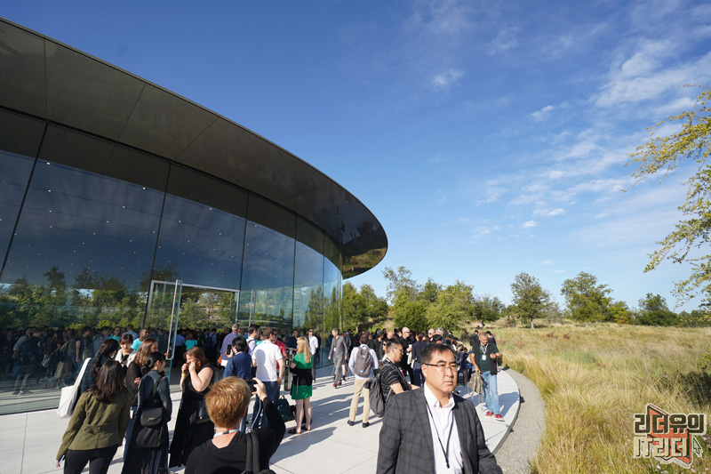 아이폰11 발표가 있었던 스티브잡스 시어터는 원형의 큰 애플 스토어처럼 생겼습니다. 사방이 다 투명한 통유리로 되어 외부와 내부가 자연스럽게 이어지는 연속성있는 건물을 보여주고 있습니다. 자연과 하나되는 건물, 환경을 중요시하는 애플의 컨셉을 자연스럽게 만날 수 있는 건물입니다.