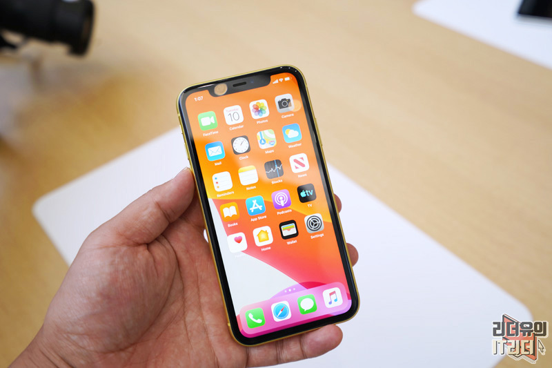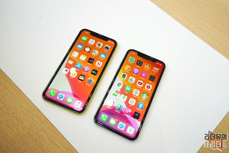 아이폰11 옐로 전면에서 보는 느낌은 비슷하지만 사이드의 옐로 라인이 포인트가 되어 줍니다.