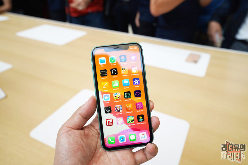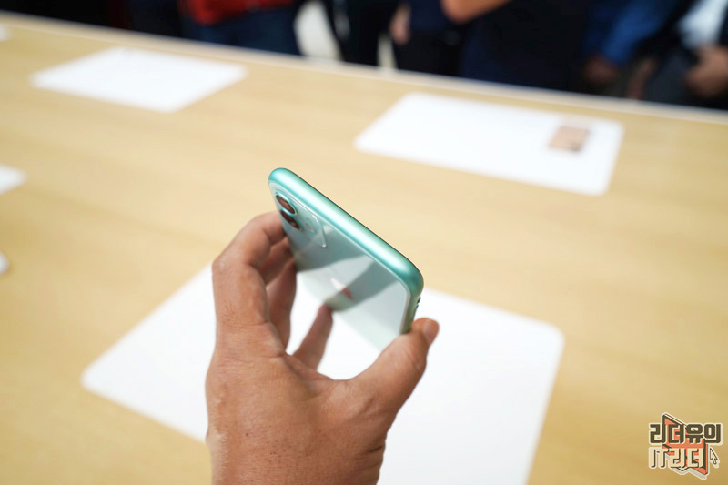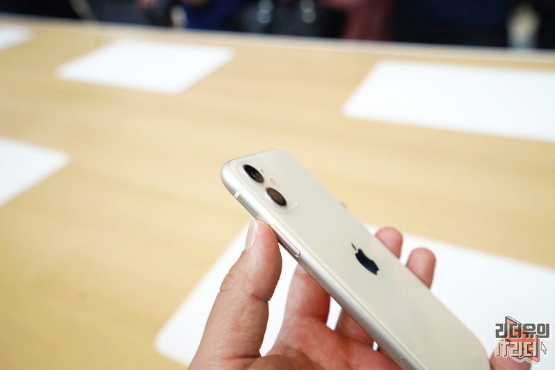 아이폰XR에서 달라진점은 듀얼카메라로 되어 있다는 점, 카메라 부분에 사각형 유리가 후면 유리와 일체형으로 되어 있습니다. 보통 카메라 영역은 별도의 유리로 만들어지는데 아이폰11은 하나의 유리라는 점이 인상적입니다.