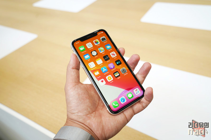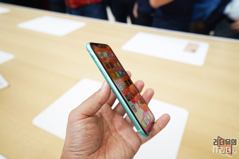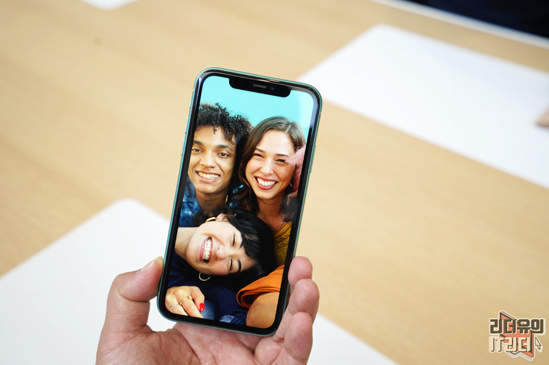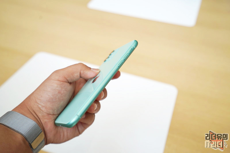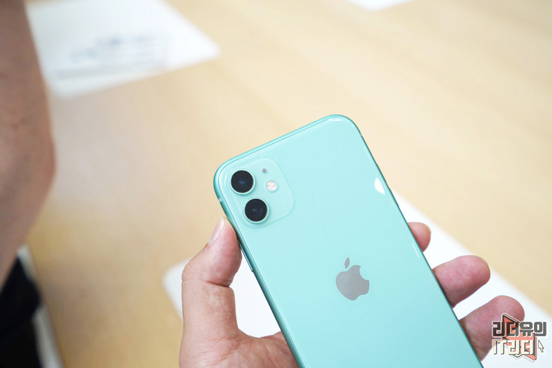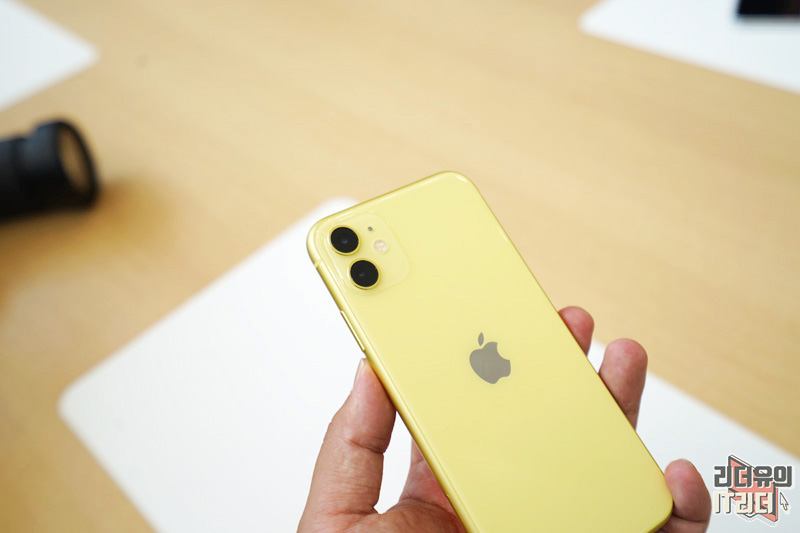 아이폰XR에서 달라진점은 듀얼카메라로 되어 있다는 점, 카메라 부분에 사각형 유리가 후면 유리와 일체형으로 되어 있습니다. 보통 카메라 영역은 별도의 유리로 만들어지는데 아이폰11은 하나의 유리라는 점이 인상적입니다.