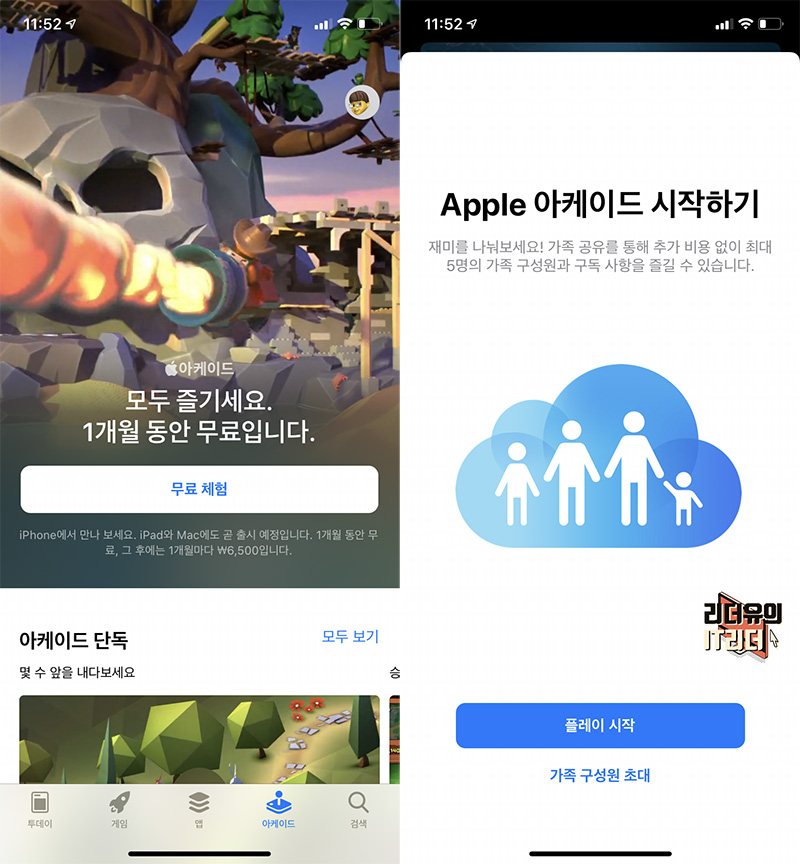 애플 아케이드는 앱스토어에 가면 하나의 카테고리로 구분되어 있습니다. 무료 체험을 누르면 바로 무료로 애플 아케이드 이용이 가능합니다. 그리고 가족 구성원이 있으면 바로 초대할 수 있도록 안내되어 있습니다.