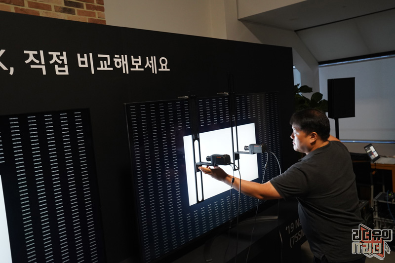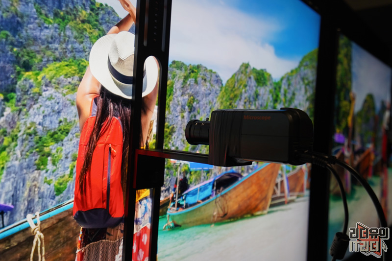 정말 해상도 차이가 크게 나는지 전문 장비를 통해서 확인해 봤습니다. 먼저 카메라 측정 결과가 실시간이라는 것을 보여주기 위해 8K 똑같다는 것을 보여주기 위해 나노셀 TV에서 보여주고