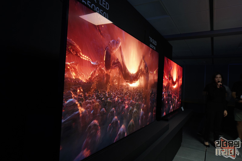 라라랜드 영화 장면도 비교해서 보여줬습니다. 라라랜드의 경우 뮤지컬 무대처럼 어두운 색채 표현이 많은데요. QLED TV는 백라이트를 사용하기 때문에 명암비가 다소 낮아, 색감을 표현하지 못하고 화면을 표현하는데도 여러 아쉬움을 보여줬습니다. 반면 올레드 TV는 블랙 컬러가 완벽한 만큼, 무한대에 가까운 명암비로 주변부 색 재현률도 훨씬 뛰어나다는 걸 느낄 수 있었습니다.